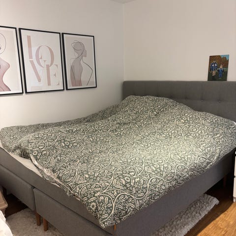 Kontinentalsäng i grått tyg. Sängen består av två underdelar med resårbotten och en övre madrassdel som ger en hög liggyta. Klädd sänggavel i matchande grått tyg ingår.