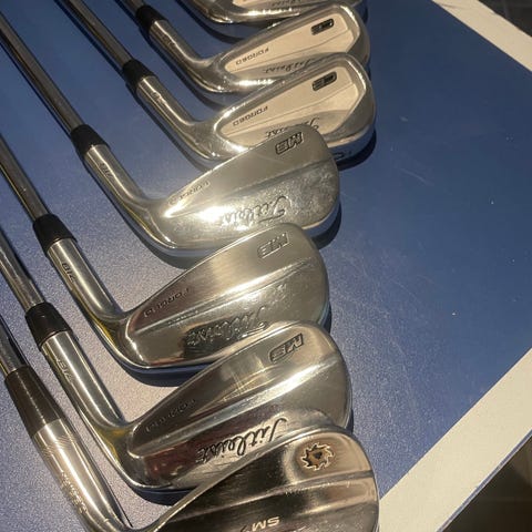 MacGregor järnset med klubborna PW, 4, 5, 6, 7 och 8. Klubborna har "REVERSE DRAFT"-design och MacGregor-grepp.redo för spel