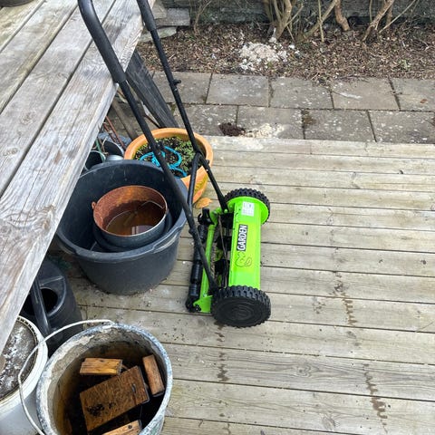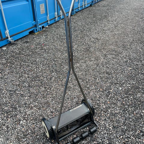 Partner handdriven gräsklippare i röd färg. Modellen är en cylinderklippare som drivs manuellt genom att skjutas framåt. Utrustad med roterande cylindrar och enkel bygelkonstruktion i metall. Passar för klippning av mindre gräsytor där man vill undvika motor- eller eldrift.
