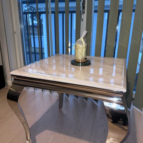 Soffbord med marmormönstrad skiva och kromade ben. Som helt ny. Ingen repa alls. Mått 60x60x60cm.