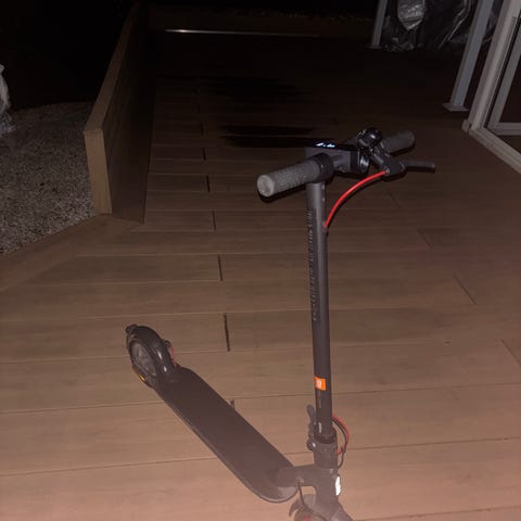 Modellen har ståplatta med halkskydd, digital display vid styret och luftfyllda däck. Baklykta funkar perfekt och blinkers.