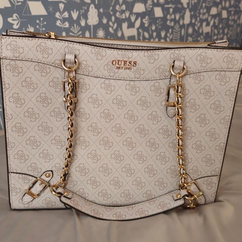 Guess handväska i fuskläder för kvinna. Väskan är ljusgrå med kontrasterande mörkare handtag och detaljer. Invändigt finns fodrat huvudfack med dragkedja, innerfickor med dragkedja samt öppna fack för mindre tillbehör. Passar för vardagsbruk och som axelväska eller handväska.