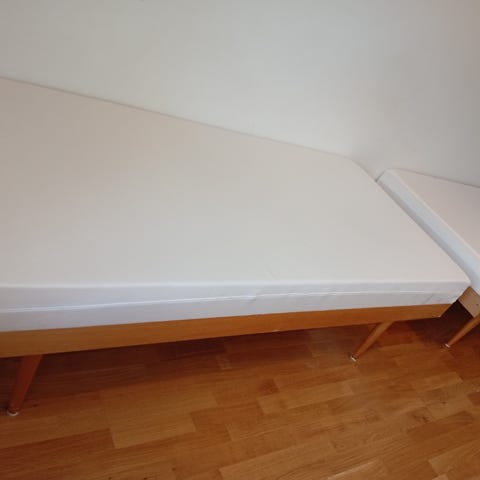 Säng 200 x 90 cm och minneskummadrass (längs väggen på bilden)