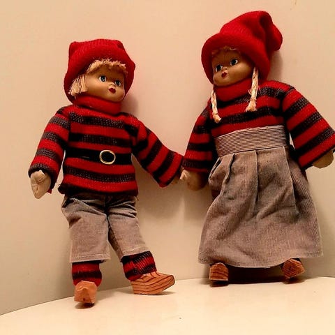 Två gamla dockor av tyg. En från Peru, en från Jamaica.