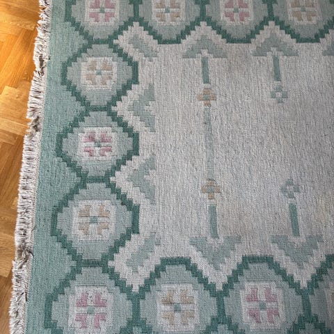 En klassisk Kelim, tålig och lätt, diskret mönster i olika färger mot beige botten. Ligger fint på golvet. 2x3 m. Inköpt för 8000 av matthandlare.