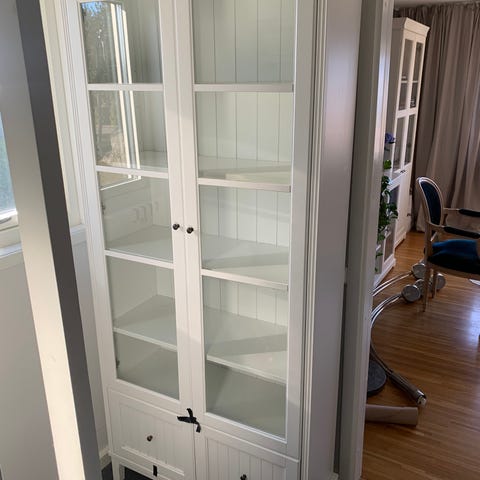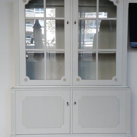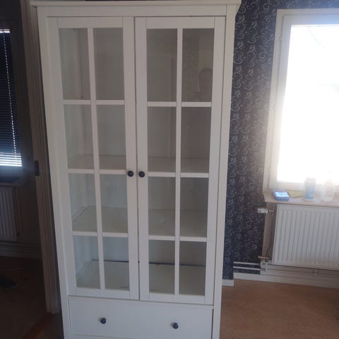 Vit vitrinskåp med glasdörrar och lådor längst ned.