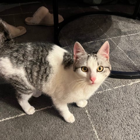 Katten har kort päls med mörka ränder . Bilderna visar katten både inomhus och vid ett fönster. Född i augusti och hade fått en vaccin och blev avmaskerad. Vi letar efter ett nytt kärleksfullt hem till vår fina katt eftersom min jag tyvärr har fått allergi. Det är ett svårt beslut för mig eftersom katten är väldigt snäll och betyder mycket för mig.