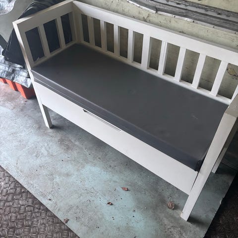 Söt träsoffa. Förvaring under sits. Går att dra ut. Behöver lite kärlek. Men är i bra skick. Bredd 140 cm.