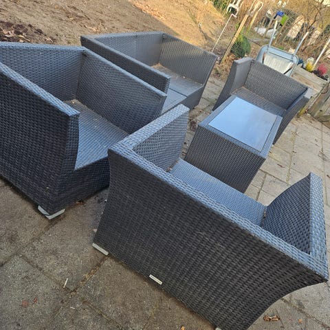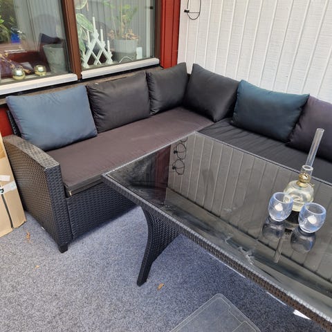Hörngrupp för uteplats med soffa och bord i konstrotting. Soffan är utformad som en hörnsoffa med flera sittplatser och lösa sitt- och ryggdynor i brun ton. Bordet har rektangulär form med mörk glasbordsskiva och underrede i grå konstrotting. Passar för användning på altan, balkong eller uteplats som sittgrupp för måltider och avkoppling.