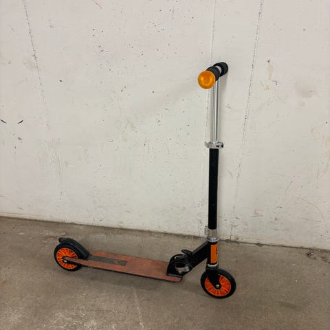 BC Racing Lab sparkcykel med vit ram och orange hjul. Justerbart styre med svarta handtag. Fotplatta med BC Racing Lab-logotyp. Passar för barn eller ungdomar för användning på plana underlag utomhus.