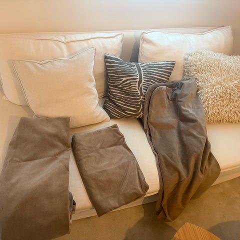 2-sits soffa med schäslong, Gransel natur klädsel. Tilköpt träben. Går at köpa extra moduler for at den blir större. Går at ta klädsel av och tvätta det.