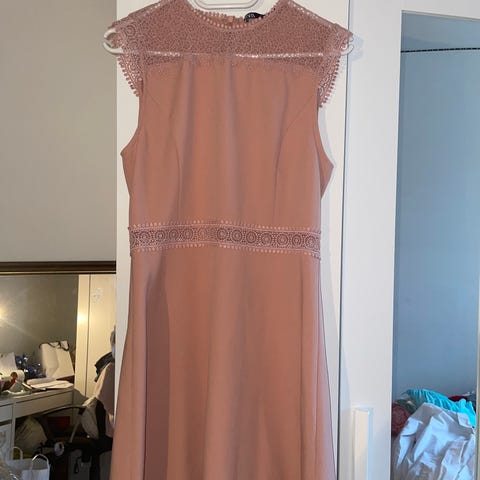 Zara party-/cocktailklänning för dam i storlek M. Klänningen är brun och täckt av paljetter på utsidan, med slät fodrad insida för ökad komfort. Ärmlös modell med smala axelband som knyts i nacken och rundad halsringning.