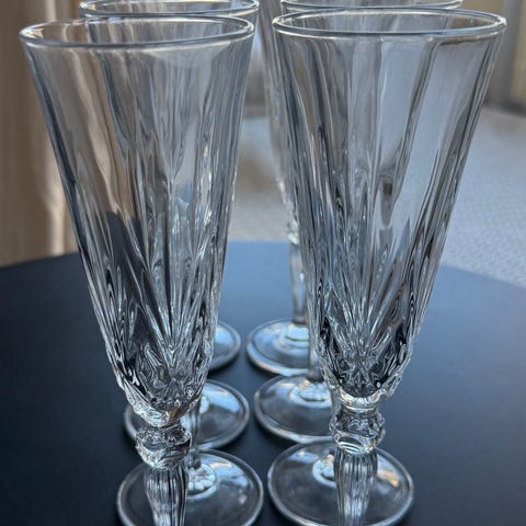 6 st Orrefors champagneglas, 5 st perfekt skick och ett av glasen har en mkt liten flisa som gått på foten.