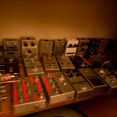 Samling gitarrpedaler för elgitarr. Pedalerna omfattar olika typer av effekter, bland annat distorsion, overdrive och multieffekt.