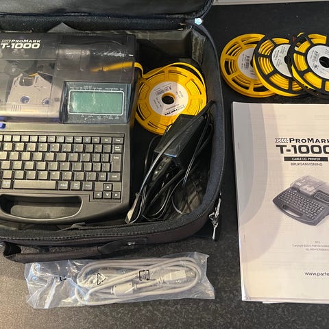 Partex Promark T-2000 märkmaskin för kabel- och komponentmärkning. Enheten har inbyggt tangentbord och display och är avsedd för utskrift av märktejp och märkprofiler inom el- och installationsarbete. Modellen är märkt med beteckning 5059C003[AA] MK50P11451 och är godkänd enligt UKCA- och CE-märkning. Levereras i originalkartong enligt bilder.
