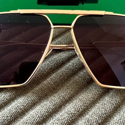 Marc Jacobs solglasögon för man. Modellen har en rektangulär form med dubbla bågar och mörka tonade glas. Bågarna är svarta med detaljer i guldfärg och raka skalmar med svarta ändar. Passar som solskydd och accessoar vid vardagsbruk och utomhusaktiviteter.