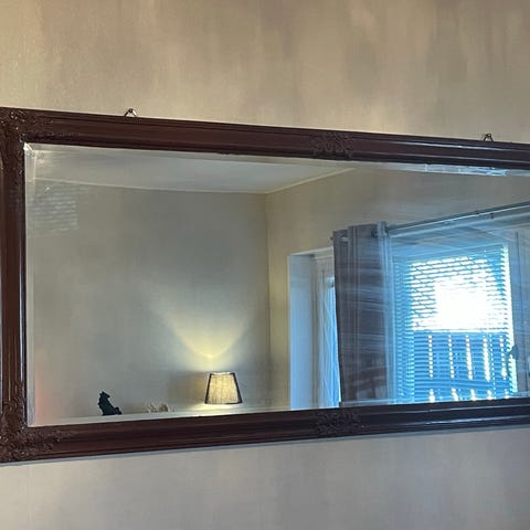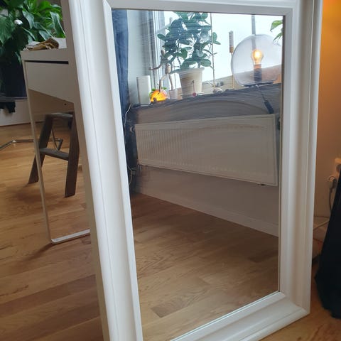 Golvspegel i vit ram. Spegeln är fristående med stöd på baksidan och kan placeras direkt på golvet.