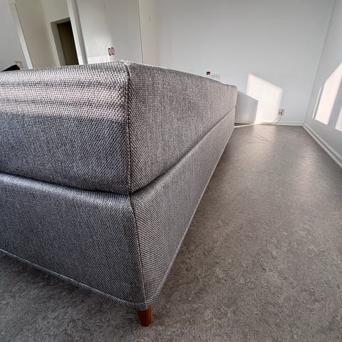 Jysk resårbotten säng i grått tyg. Sängen har träben och en ljus madrassdel upptill. Passar som enkelsäng i sovrum, gästrum eller studentbostad. Neutral färgsättning som fungerar i de flesta inredningsstilar.Inga husdjur, rökfritt hus.