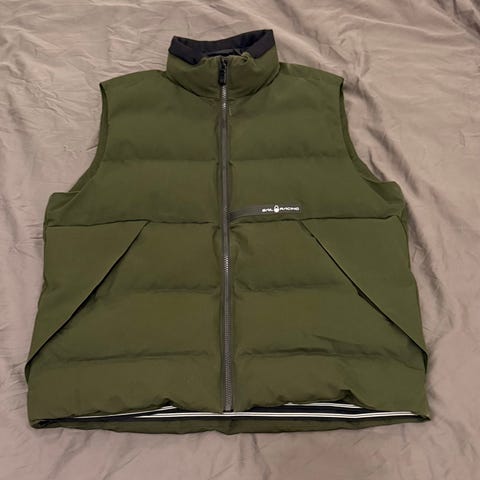 Moose Knuckles dunväst för herr i storlek L. Västen är grön och vadderad med dun för extra värme. Modellen har hög krage, hel dragkedja framtill och två stora framfickor. Passar som ytterplagg eller som mellanlager vid kallare väder.