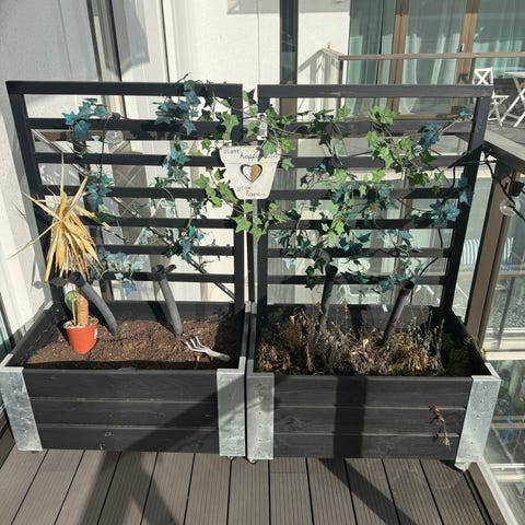 Säljer min fina robusta odlingslåda i trä med två plastinsatser. Lådan är avsedd för odling av exempelvis kryddor, blommor eller grönsaker på altan eller i trädgård. Träramen är byggd av liggande brädor och plastinsatserna är lösa och kan tas ur för rengöring eller omplantering. Passar för odling i upphöjd nivå och kan placeras mot vägg eller räcke.
