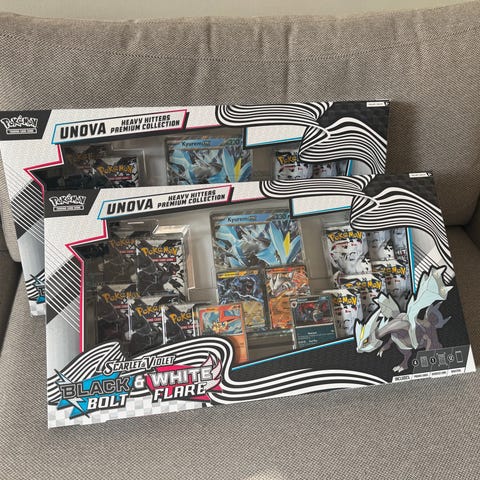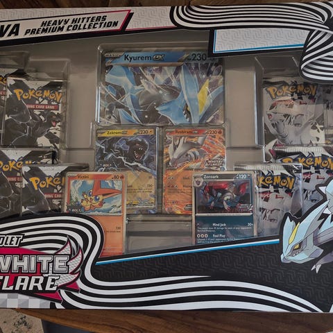Pokémon Scarlet & Violet Black & White Bolt Flare samlarlåda med spelkort. Lådan innehåller flera boosterpack med Pokémon-kort, promokort samt tillbehör för spelet Pokémon Trading Card Game. Förvaringslådan är utformad med motiv från Unova-regionen och karaktärer från Black & White-serien. Produkten är avsedd för samlare och spelare av Pokémon TCG.