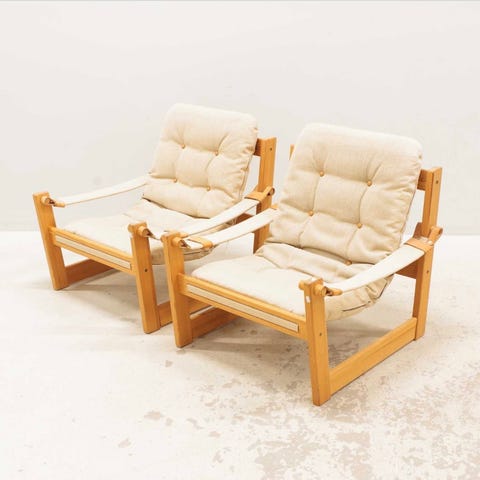Synligt använda. Tygen sitter inte helt fast undertill och baktill. På en stol har tyget lossnat på sidan (syns på bilden). Saknas några skruvar.
