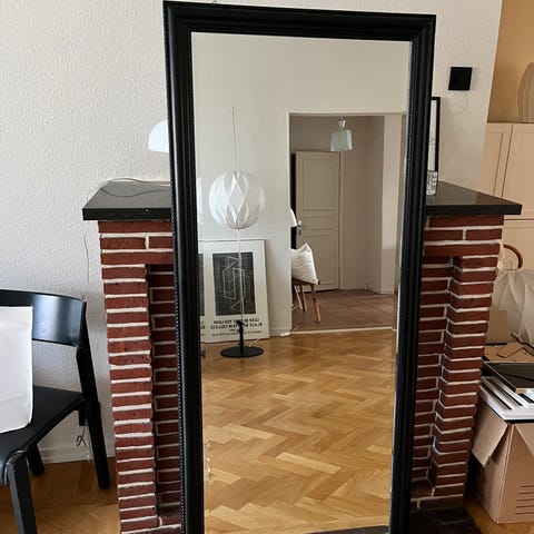 Vacker och stor rektangulär (golv)spegel med brun träram. Ramen har dekorativt mönster längs kanterna. Spegeln är stor nog att visa hela kroppen och kan lutas mot vägg eller hängas upp beroende på upphängning. Passar i hall, sovrum eller vardagsrum för helkroppsspegling och rumsförstoring.