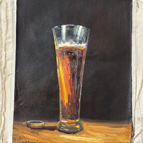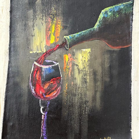 Tavla med motiv av stilleben som föreställer vinflaska, vinglas, vattenmelon och druvor mot abstrakt bakgrund. Färgstark målning med tydliga kontraster mellan motiv och bakgrund.
