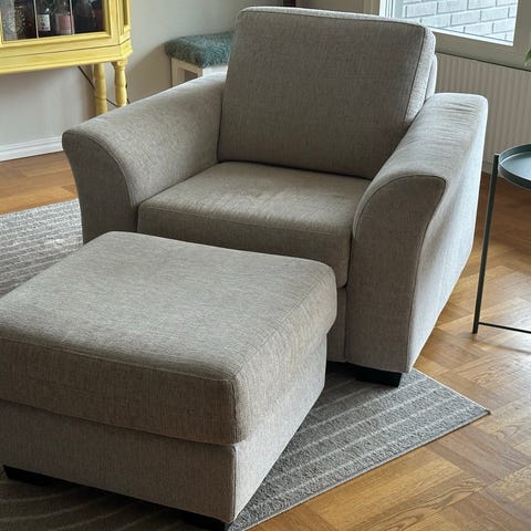 Äldre fåtölj med fotpall. Märken på benen men i övrigt fint skick. Rökfritt hem men katt finns i hemmet.
