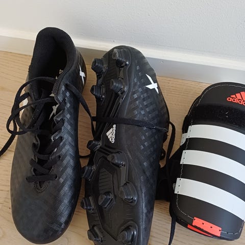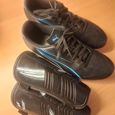 Fotbollsskor svart/gul stl 30 + benskydd