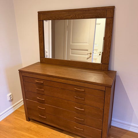 Fint set att ha hemma i sovrummet. Enkla lådor med hjul i skena, rullar fint. Inte särskilt slitna utan fortfarande till synes snygga och fräscha!