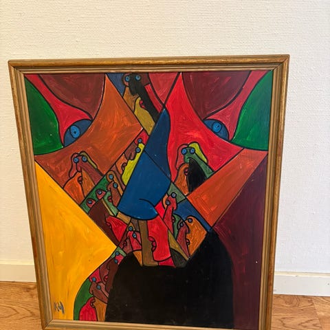 Tavla på duk målad 1990 ”Dagens framtid”. Ramyttermått ca 55 X 48 cm, mått på själva duken 53 X 45 cm. Vid intressse ring 0733-495 222.