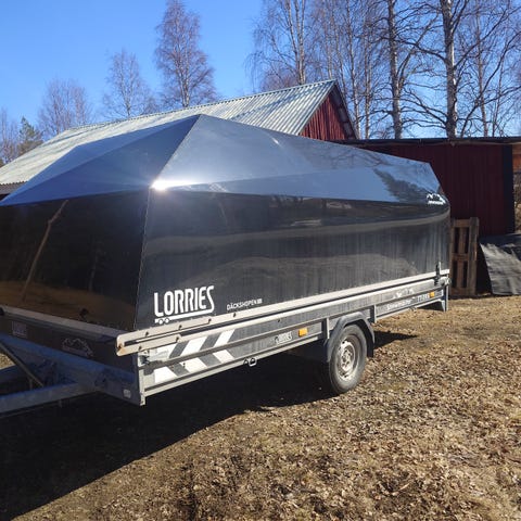 Brenderup släpvagn utrustad med svart Fogelsta kåpa. Släpet har tippfunktion och är försett med kåpa som kan öppnas uppåt för enkel lastning och lossning. Kåpan ger skyddad transport av last och gör släpet lämpligt för exempelvis skrymmande eller väderkänsligt gods. Galvad ram och träbotten. Registreringsskylt och belysning monterad baktill. Tekniska data som totalvikt och lastvikt framgår av typskylten från Brenderup AB på dragstången.