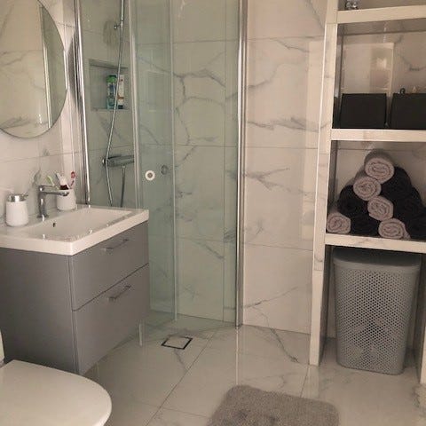 Duschhörna med glasväggar och kromade profiler. Utrustad med takdusch och handdusch. Väggmonterad duschblandare och duschset. Passar för hörnmontage i badrum med kaklade väggar och golvbrunn i duschutrymmet.