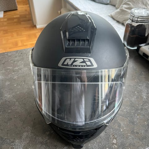 SMK motorcykelhjälm av integraltyp i svart färg. Hjälmen har klart visir och vadderad insida. Storlek M enligt märkning. Lämplig för motorcykel- eller mopedkörning där integralhjälm önskas för heltäckande huvud- och ansiktsskydd.
