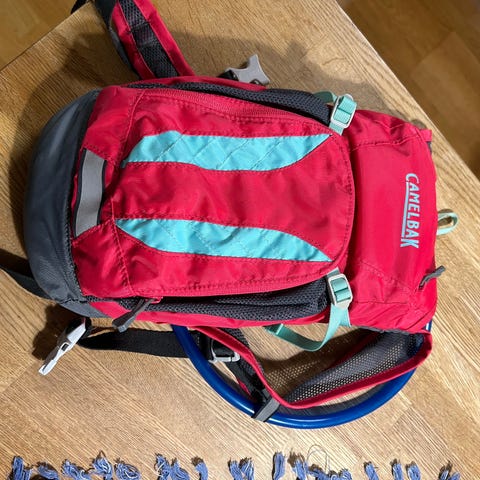 Modellen heter Raptor och är på 10 liter. Har en vätskeblåsa med en drickslang. Den lilla fästannordningen på baksidan är en supersmart liten hjälmhållare som har fungerat superbra för mig. Alla ryggsäckar borde ha en. Jättelätt att dra ut, kroka på hjälmen och sen gå.