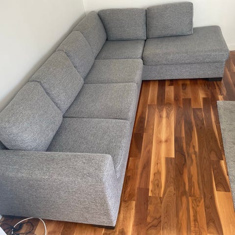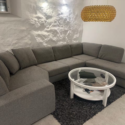 Hörnsoffan består av två delar men de kan inte användas separat. Långa sittdelen är 150 cm, den korta är 90 cm lång.