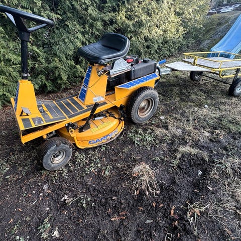 Åkgräsklippare med tillhörande tippvagn. Gräsklipparen är en sittmodell med fyrhjulschassi och klippaggregat under maskinen. Tippvagnen är svart med två hjul och dragstång anpassad för koppling bakom åkgräsklippare. Utrustningen lämpar sig för klippning av gräsmatta samt transport av trädgårdsavfall, jord eller annat material inom tomt eller trädgård.
