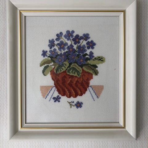 Ovala målningar med blommotiv i olika färger. Tre är monterade i ljusa ovala ramar och två är lösa. Motiven föreställer olika sorters blommor i blått, vitt, rosa och grönt. Passar som väggdekoration i hemmet.