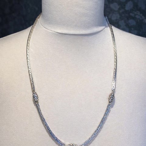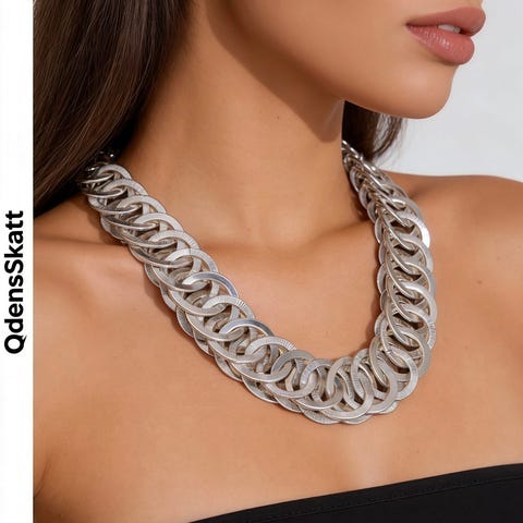 & Other Stories halsband för kvinna i stål. Halsbandet är i silverfärgat stål med flera sammanlänkade ringar framtill som skapar ett brett, dekorativt parti över nyckelbenen. Kedjan består av tätt satta länkar som ger ett massivt intryck. Passar som smycke till olika typer av klädstilar vid både vardag och mer uppklädda tillfällen.