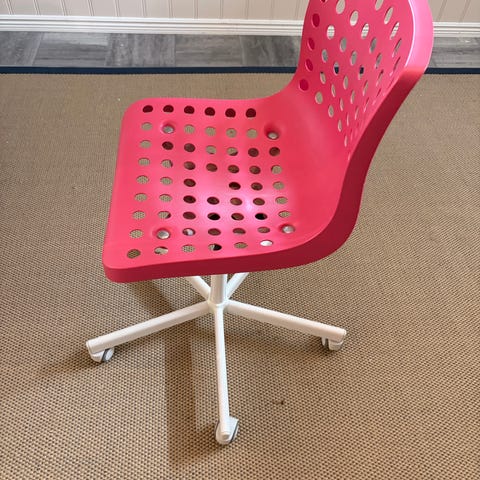 IKEA barnstolar med sits i plast i färgerna rosa och blå. Stolarna har perforerad rygg och sits med runda hål samt vit underdel med femarmat kryss och hjul. Höjden är justerbar med gasfjäder. Passar som skrivbordsstolar eller arbetsstolar för barn i barnrum eller vid skrivbord. Plast och metall i konstruktionen gör stolarna lätta att torka av och hålla rena.