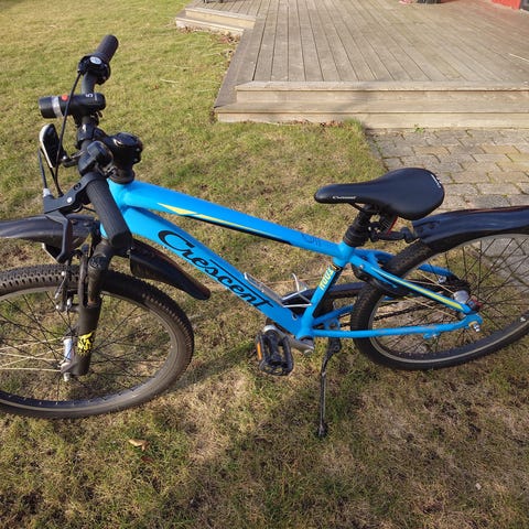 Crescent barncykel med 24" hjul. Cykeln har svart ram med rosa detaljer och är utrustad med korg fram, skärmar, kedjeskydd, lås med nyckel och pakethållare.