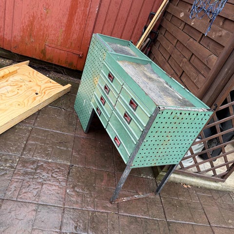 Stabil arbetsbänk med massiv träskiva, två rymliga hurtsar och stor verktygstavla. Perfekt för garage, hemmagym eller hobbyrum.