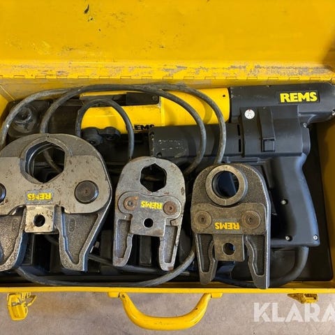 REMS elektrisk pressmaskin för rörarbeten. Levereras i gul metallkoffert med formgjutet insatsfack för maskin och pressbackar. Utrustningen inkluderar flera utbytbara pressbackar för olika dimensioner. Maskinen är nätansluten med elkabel och är avsedd för professionellt bruk vid pressning av rörkopplingar i VVS- och installationsarbeten.