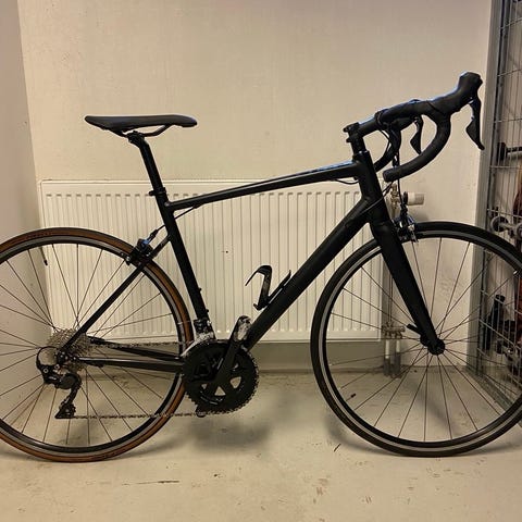 Perfekt för Vätternrundan eller andra lopp. Aluminiumram 54cm (M) och kolfibergaffel. Välskötta Shimano Tiagra-växlar. En bra trainer medföljer.