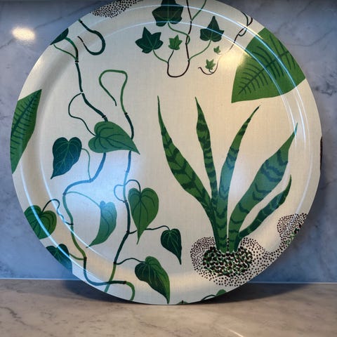 Svenskt Tenn Windows bricka rund blå mönstrad. Brickan har ett botaniskt mönster i blått mot ljus bakgrund och är formgiven av Josef Frank för Svenskt Tenn. Baksidan är träfärgad med tryckt logotyp och modellnamn. Passar som serveringsbricka eller som dekorativ inredningsdetalj i hemmet. 49 cm. I fint använt skick.