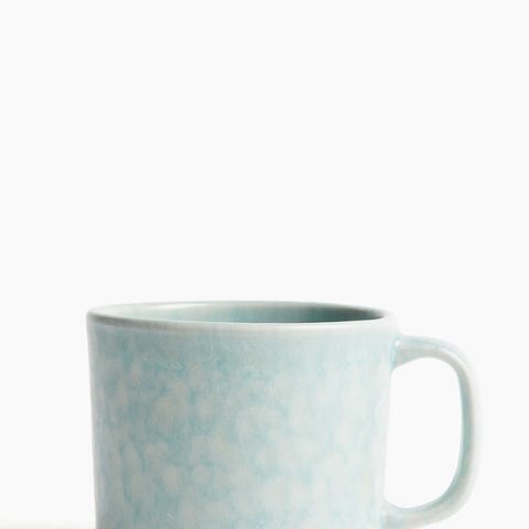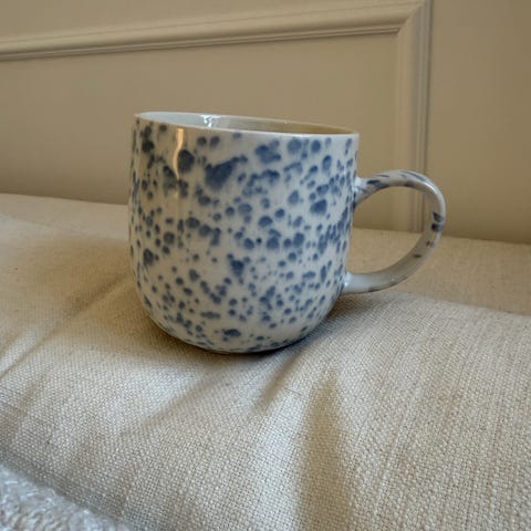 H&M Home mugg i stengods. Muggen är vit med blå prickigt mönster och har handtag. Passar för varma och kalla drycker i kök eller vardagsrum. Tål diskmaskin och mikrovågsugn enligt märkning på undersidan.
