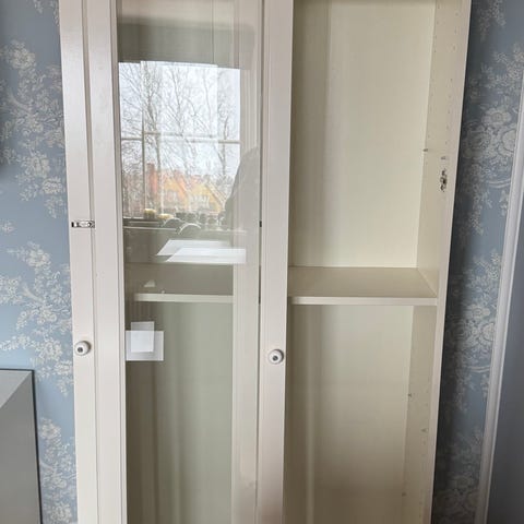 Säljer nu min svarta Billy-bokhylla med Oxberg-glasdörr för endast 250 kr vid snabb affär.