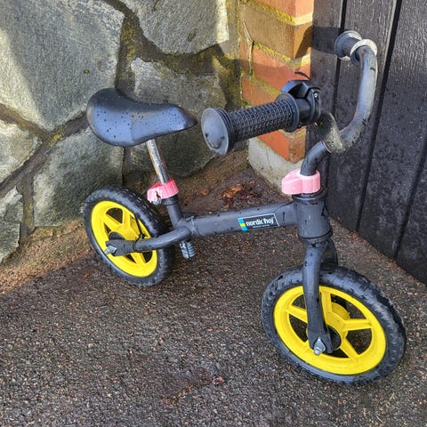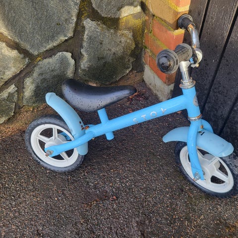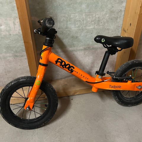Vitus springcykel, extremt lätt på 1,7 kg (enligt köksvågen 😊) och väldigt smidig för barn. Punkteringsfria däck som du aldrig behöver pumpa. Använd av våra 2 döttrar som har älskat den.