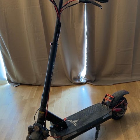 Elsparkcykel i svart färg. Utrustad med digital display på styret som visar hastighet och andra grundläggande uppgifter. Framlampa sitter monterad vid styret för bättre sikt. Handbroms finns på höger sida av styret. Stöd finns på sidan av fotplattan. Passar för kortare transporter och pendling på cykelvägar och andra släta underlag. Drivs av elmotor och laddningsbart batteri (tekniska data som räckvidd och motoreffekt är inte angivna). Finns laddare till också.